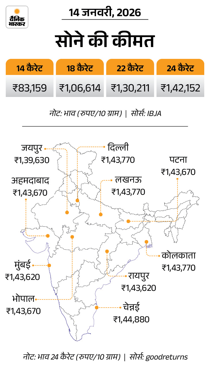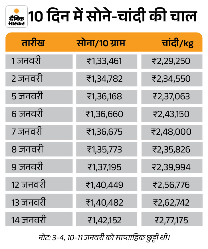 तीन दिन में चांदी 34 हजार रुपए से ज्यादा महंगी हो चुकी है। वहीं, 10 ग्राम 24 कैरेट सोने का भाव 1,868 रुपए बढ़कर 1,42,152 रुपए के ऑल टाइम हाई पर ओपन हुआ है। कल इसकी कीमत 1,40,482 रुपए प्रति 10 ग्राम थी।
